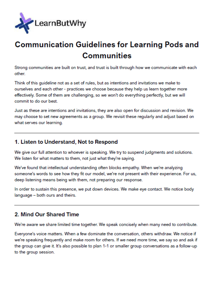 Deep listening • Speaking from experience • Honoring privacy • Taking responsibility for feelings • Separating observations from judgments • Making clear requests • Slowing down when needed • Making room for different perspectives